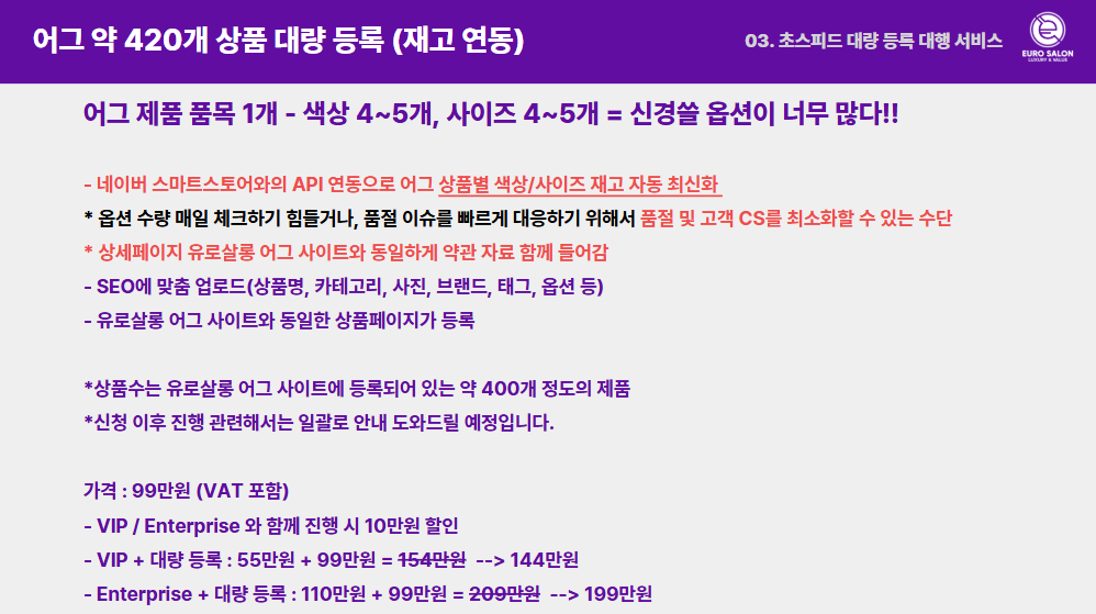 1. 상품 대량등록 서비스는 상품 등록 완료 후 환불이 불가능합니다.